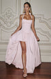The Keira Maxi Dress in blush features a sleek straight neckline with halter straps and a tightly gathered bust panel for a refined silhouette. Its lace-up back with shirred detailing and internal boning ensure a perfect fit, while the dramatic puffball skirt and thigh-high split add elegant movement and allure.